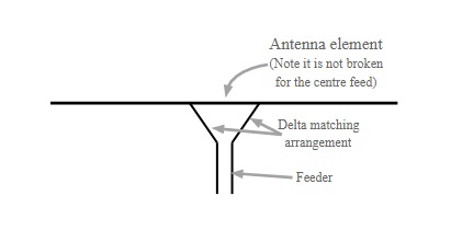 Это можно легко согласовать с помощью так называемого дельта-согласования — оно получило свое название от формы устройства согласования импеданса. Дельта-согласование работает, потому что оно питает антенну в точках, где соотношение напряжения и тока таково, что импеданс намного выше. Это очень полезно для таких антенн, как Yagi, где импеданс фидера намного ниже 50 Ом из-за близости используемых паразитных элементов. Стоит отметить, что дельта-согласование антенн по-прежнему требует использования симметричного фидера. Это означает, что для любого перехода на несбалансированный фидер, такой как коаксиальный кабель, потребуется балун для преобразования фидера из сбалансированного в несбалансированный.