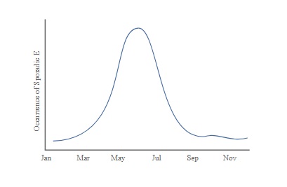 Можно построить очень приблизительную кривую появления спорадического E в регионах с умеренным климатом в течение года. Это следует рассматривать как приблизительное руководство только ввиду изменений в зависимости от местоположения и спорадического характера режима распространения.