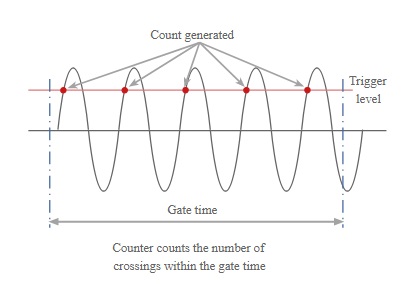 Чтобы проиллюстрировать операцию, если время, в течение которого счетчик частоты настроен на подсчет, составляет секунду, т. е. время стробирования, равное секунде, и сигнал пересекает точку запуска сто раз, будет сто повторений сигнала в в секунду, т.е. его частота равна 100 Герц.